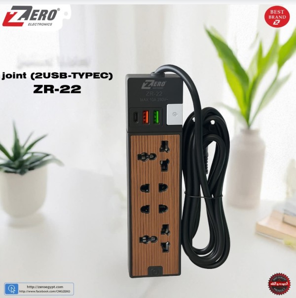 مشترك كهرباء zr-22 بـ5 منافذ ومنفذين USB ومنفذ USB نوع C مع تحكم في الطاقة عبر زر - طول 1.5 متر